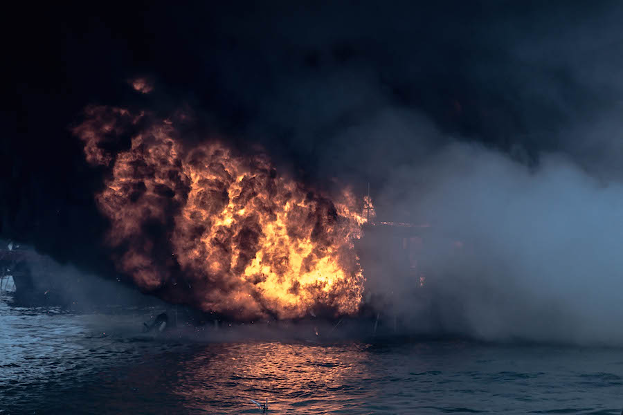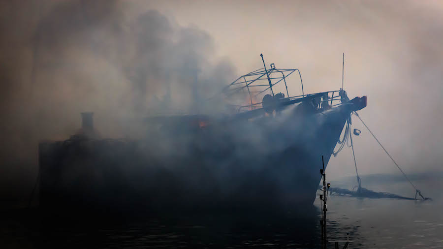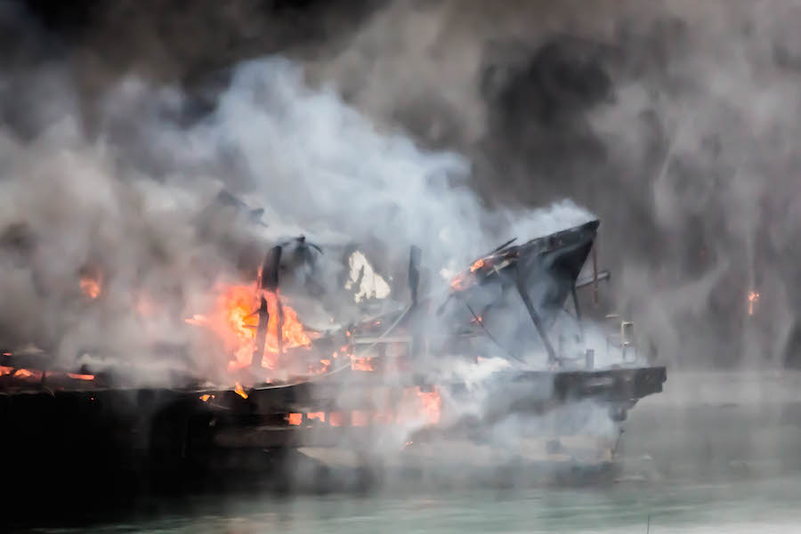The blaze is thought to have began on a fishing boat that then brunt through its anchor rope and drifted towards other boats, igniting them too.
