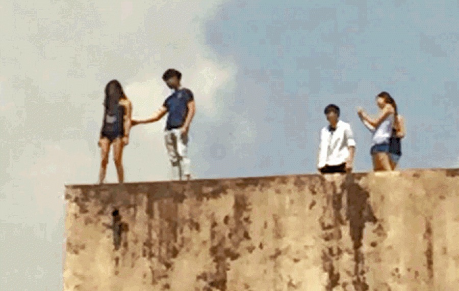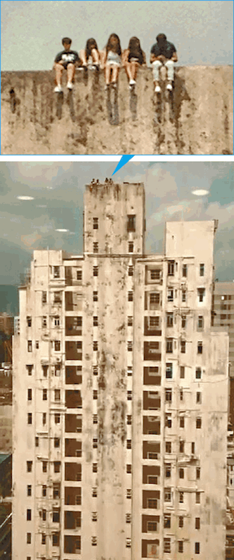 At 2:15pm yesterday, a passerby surnamed Lam noticed a group of five young adults strolling around a rooftop. The youngsters naturally took out a selfie stick, taking photos while their legs dangled off the ledge of the rooftop, reports Apple Daily.