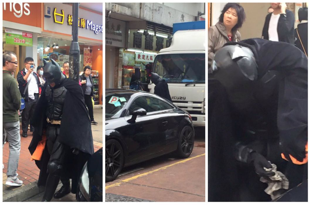 Earlier today, pedestrians on Fa Yuen Street in Mong Kok were rather tickled — and perhaps even starstruck — when a Batsuit-wearing man appeared and proceeded to rather awkwardly wipe a car.
