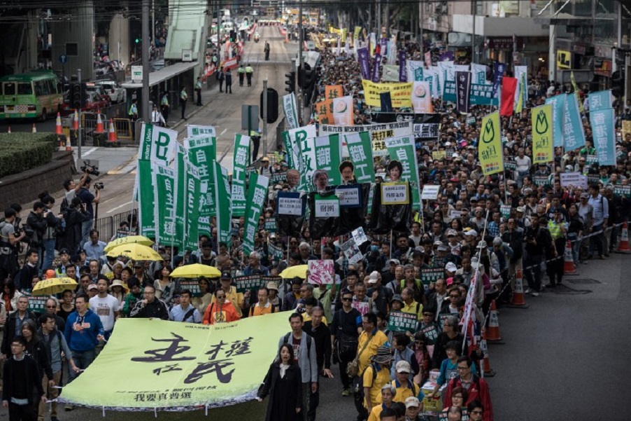 Thousands of protesters, chanting “Sovereignty belongs to the people!” marched through Hong Kong on New Year’s Day to protest at the government’s legal bid to unseat some pro-democracy lawmakers.