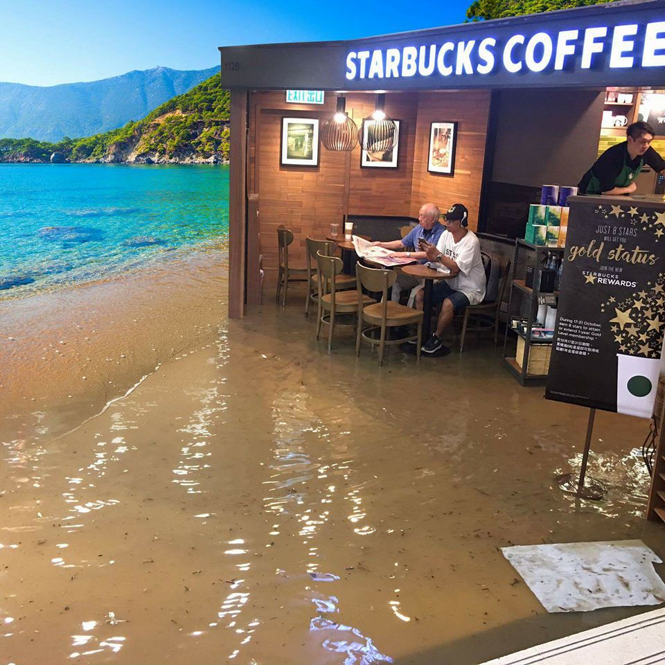 You see, as people were trapped on buses or simply abandoning their vans in the sometimes waist-deep water, one resilient man led by example, calmly continuing to read his paper at a Chai Wan Starbucks, wet ankles be damned.