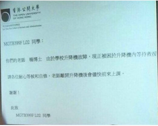 Apple Daily reports that the instructor, surnamed Yeung, called his colleague to email his students, saying that their instructor is trapped in a lift, waiting to be rescued and that students should wait patiently and review study materials in the meantime, as the instructor will be on his way as soon as possible.