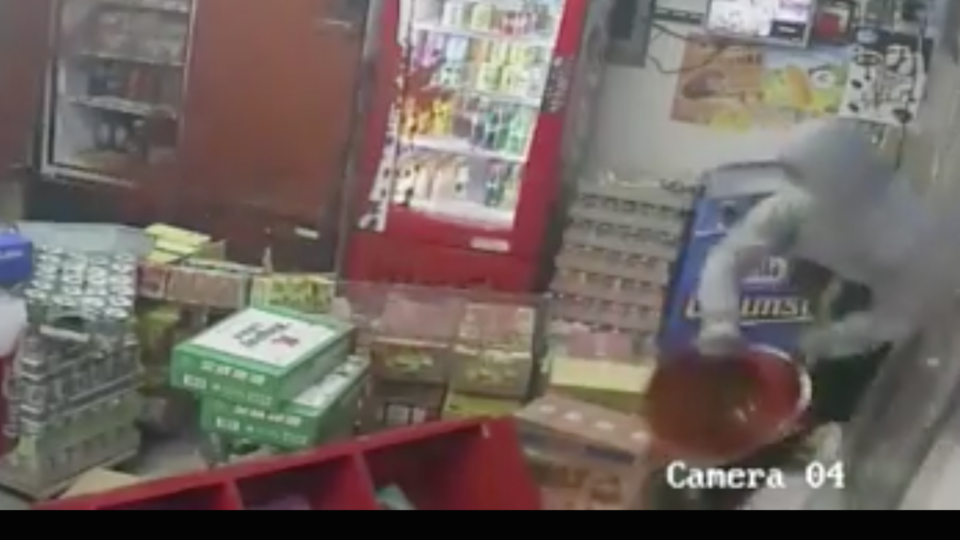 For about 20 seconds, the men swing the weapons wildly around the shop, smashing shelves and items and shattering the glass windows of fridges.