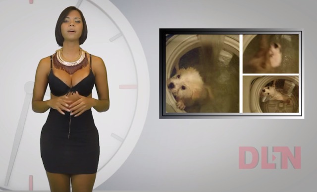 Also uploaded by El Cavo, the little clip – this time reporting on the dog in a washing machine tragedy – starts off innocently enough, with a smart looking woman in a shirt and pencil skirt.