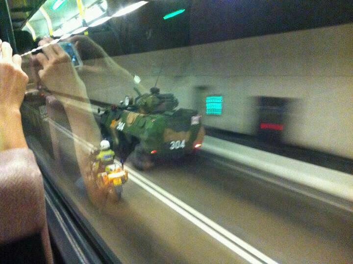 While Hongkongers slept soundly, at least four PLA tanks rolled silently through the city. Witnesses, who couldn’t be blamed if they wet themselves, saw armored personnel carriers with short guns mounted on turrets traveling on regular roads in Tin Shui Wai, Yau Ma Tei, and Jordan early Thursday morning, reports Apple Daily. Yikes!