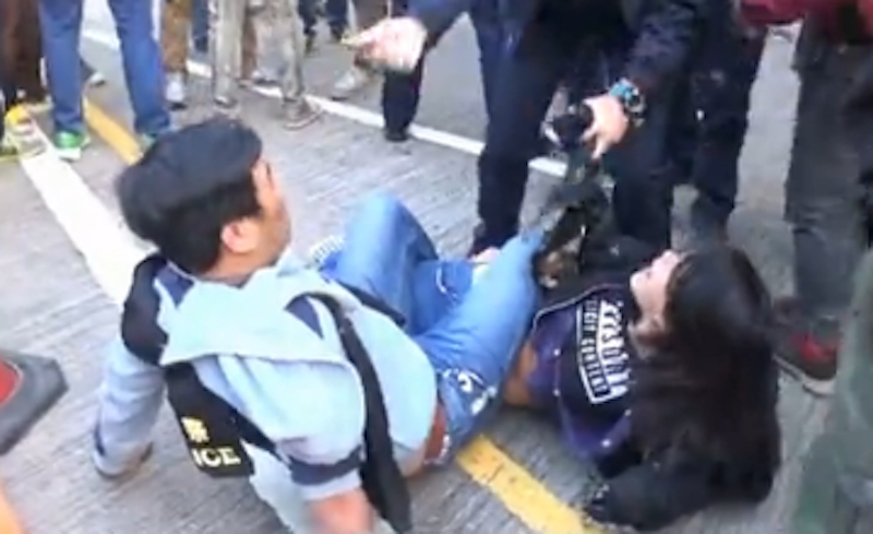 The incident occurred during clashes between pro-democracy and anti-Occupy protesters, which led to three people being arrested (including a 13-year-old), and six police officers injured.