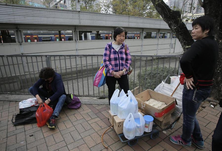 A steady stream of border-crossers – several identifying themselves as Hong Kong residents – whipped out tins of milk powder and offered them to the eager recipients.
