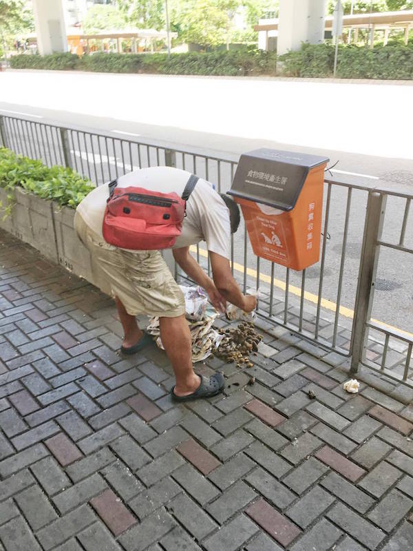 At the junction of Oi Shun Road and Oi Yee Street, he spotted a man apparently digging through a “dog excreta collection bin” (that’s what they’re officially called, FYI) with his bare hands, methodically decanting the canine turds off of old newspaper and into a heaping, stinking pile on the ground.