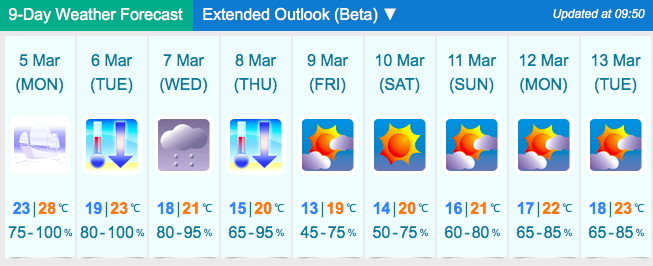 Today’s weather is much like yesterday’s — humid and foggy, with lows of 23 degrees Celsius and highs of 28. Although sunny throughout most of the day, there will be patchy rain tonight and it is expected to be cloudy with intermittent rain through Friday.