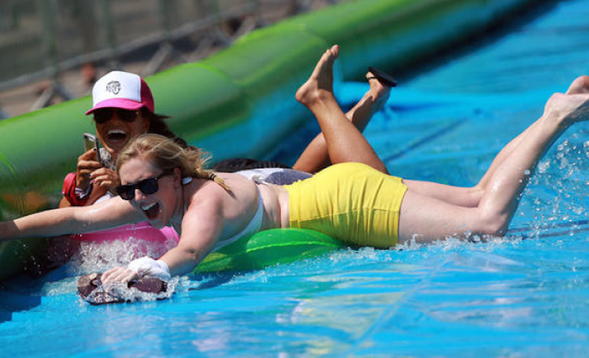 Imagine: a massive, 300-metre-long tarp on a sloping road, covered in the exact amount of water needed for optimum, high-speed sliding on a board, a tube, or your bare belly.