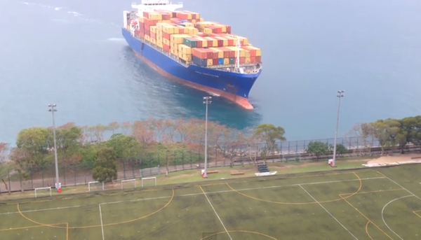 A 193-metre-long container ship, the Hansa Constitution, was blown off course on its way to Shenzhen yesterday afternoon, running aground onto the University of Hong Kong sports ground in Pok Fu Lam.