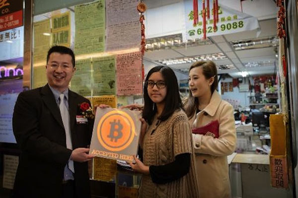 ANXBTC bitcoin exchange chief executive Ken Lo (L) poses with a shop keeper accepting bitcoins during the opening ceremony of the city’s first bitcoin retail shop in Hong Kong