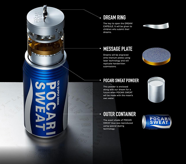 Apparently inspired by the 2013 discovery of water on the moon, the PR stunt will see the dreams of 120 children, plus some Pocari Sweat powder, sent to the moon in 2016.