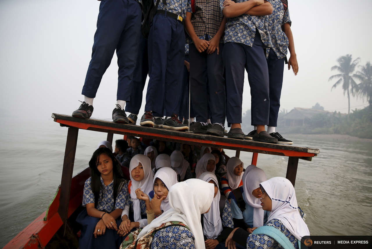 Students stand on the roof of a wooden boat as haze blankets the Musi River while they travel to school in Palembang, on Indonesia’s Sumatra island, September 10, 2015. REUTERS/Beawiharta