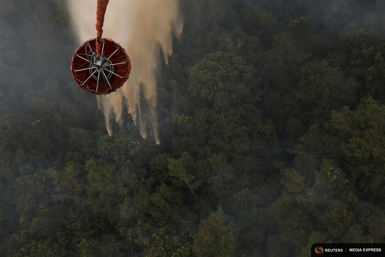 An Mi-17 helicopter dumps water on a burning forest at Ogan Komering Ulu area in Indonesia’s south Sumatra province, September 10, 2015. Photo: REUTERS/Beawiharta