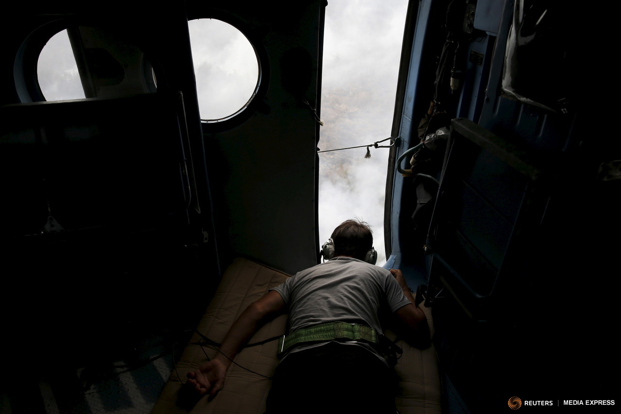 A crew member of an Mi-17 helicopter lays on the floor of the chopper as water is dumped on a burning forest at Ogan Komering Ulu area in Indonesia’s south Sumatra province, September 10, 2015. Photo: REUTERS/Beawiharta