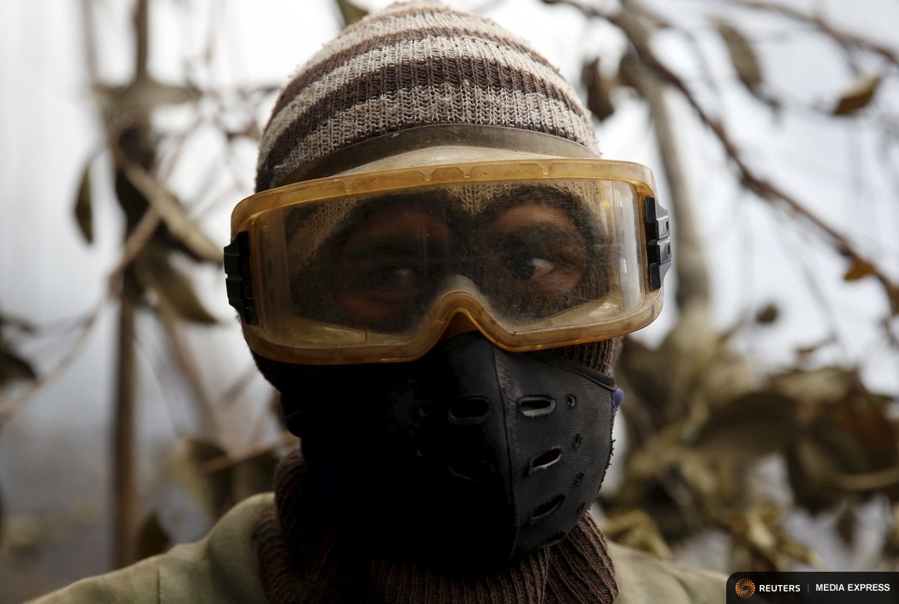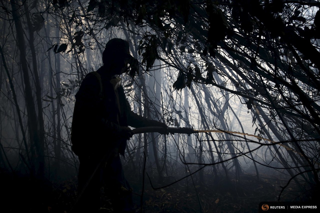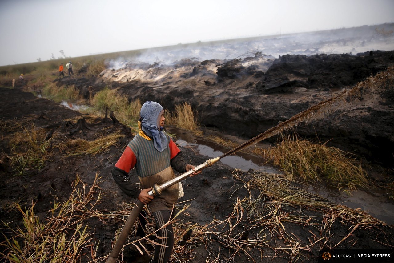 A man wears a mask as he extinguishes a fire. Photo: REUTERS/Beawiharta