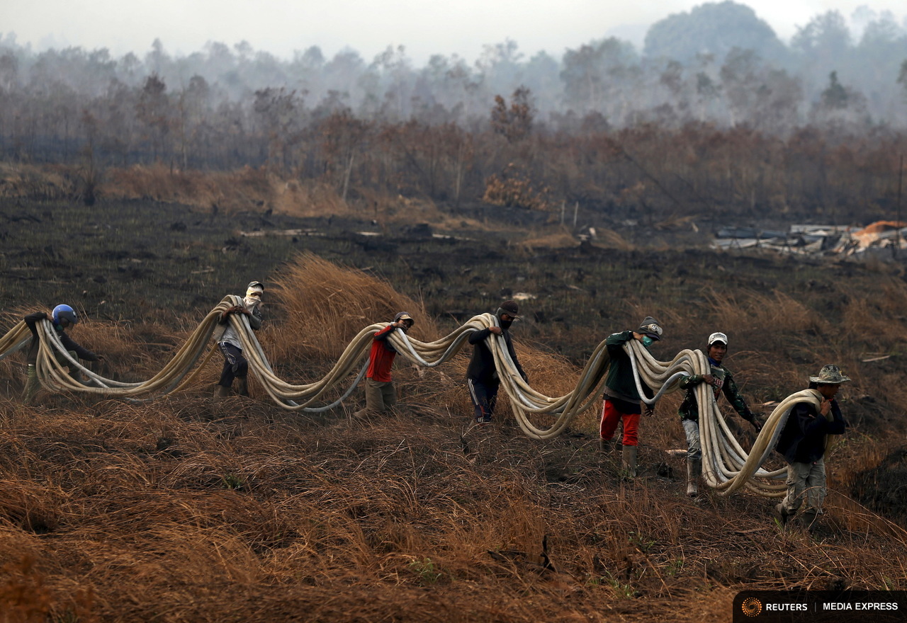 Workers carry water pipes through a burnt palm oil plantation. Photo: REUTERS/Beawiharta