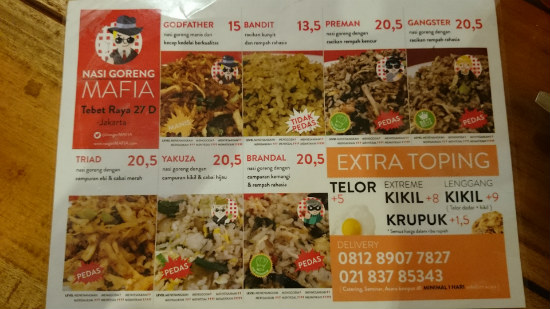 But, as one often learns in this country, the ‘mafia’ people are talking about in Tebet is actually an akward abbreviation of ‘makanan favorit orang Indonesia’ (Indonesians’ favorite dish), and it refers to a popular restaurant in the area, Nasi Goreng Mafia.