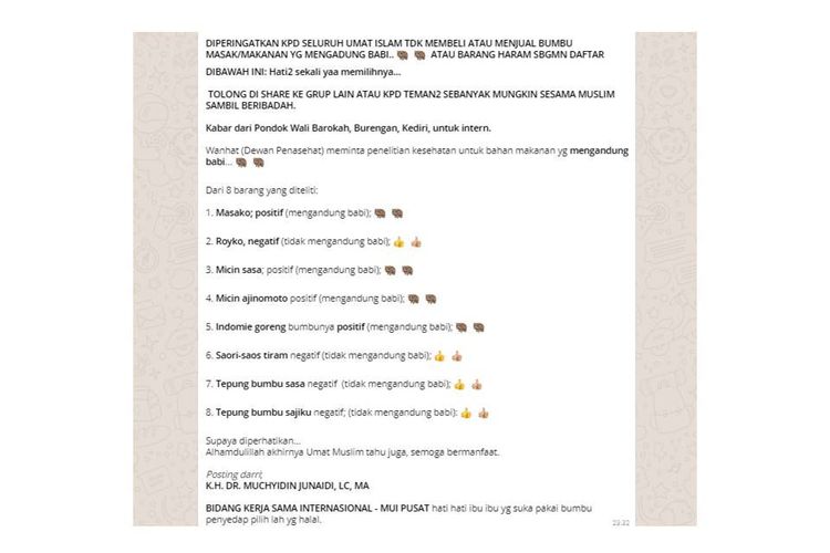 Recently, a chain message has been going around on WhatsApp groups warning Muslims in Indonesia that certain food products contain pork. Among the eight products alleged to contain porcine products were the seasoning in Indomie Mi Goreng, Ajinomoto, as well as local flavor enhancers like Masako and Royko.