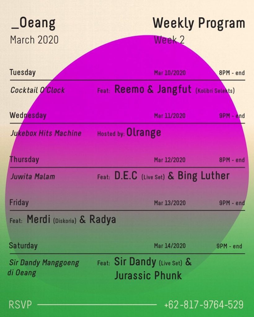 Picking up the festivities of National Music Day, which falls on March 9, the celebration continues this week at Oeang. Enjoy tunes from Merdi of Diskoria and Radya on Friday, and prepare to laugh to the witty lyrics of singer-songwriter Sir Dandy during his live performance and continue to dance to a DJ set by Jurassic Phunk.