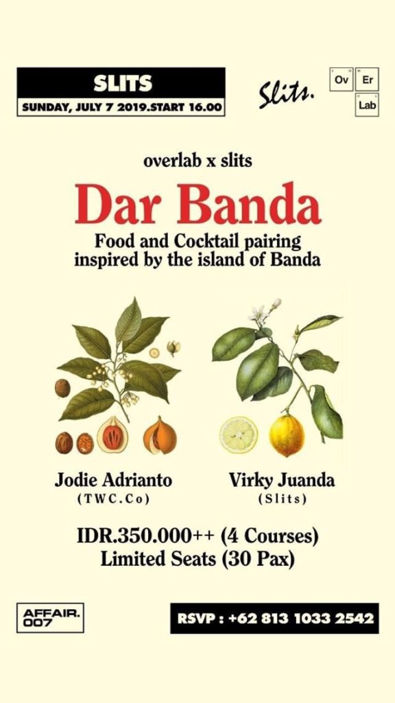 Overlab and Slits present Dar Banda, the second series of Sunday Pairing: Food & Cocktails. Dar Banda will feature a four-course dinner inspired by the delicacies from the island of Banda Neira in the Maluku province, made by Jodie Adrianto from Third World Culinary Company. The dinner will be paired with house cocktails selected by Virky Juanda from Slits. Book your spot soon because the dinner is limited for 30 people only.