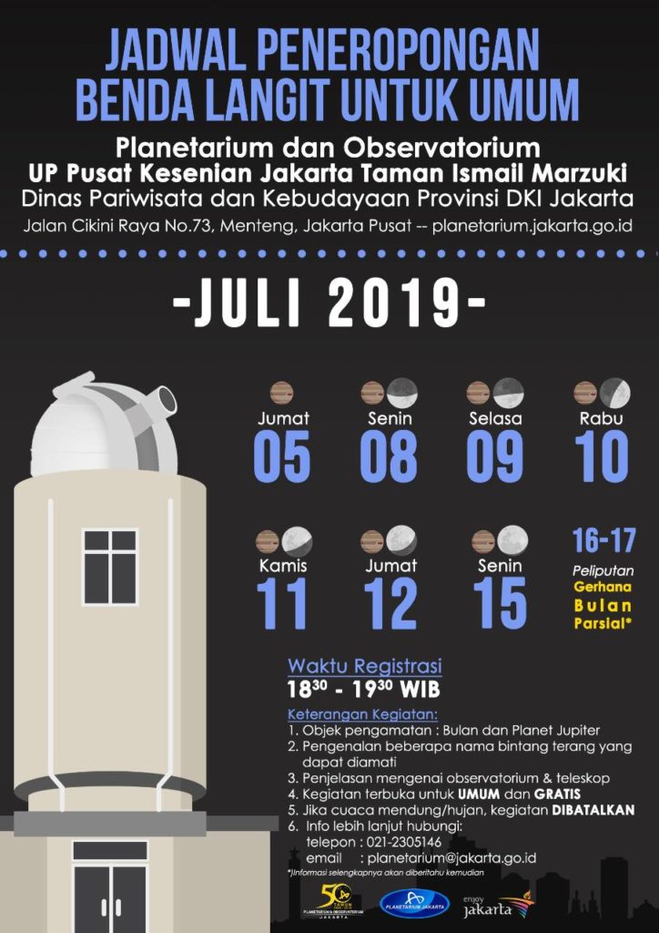 July 5, 8-12, and 15; as well as July 16 and 17 for partial lunar eclipse observation at Planetarium Jakarta. Free entry, registration opens from 6.30-7.30pm