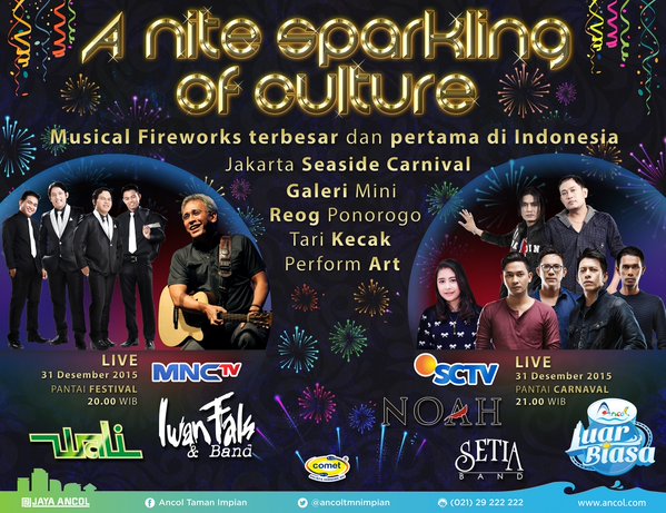 Dubbing their NYE celebration “A Nite Sparkling of Culture”, Ancol will be holding numerous events including a Seaside Carnival Parade, art show, and “musical fireworks” at Lagoon Beach (which start at midnight).