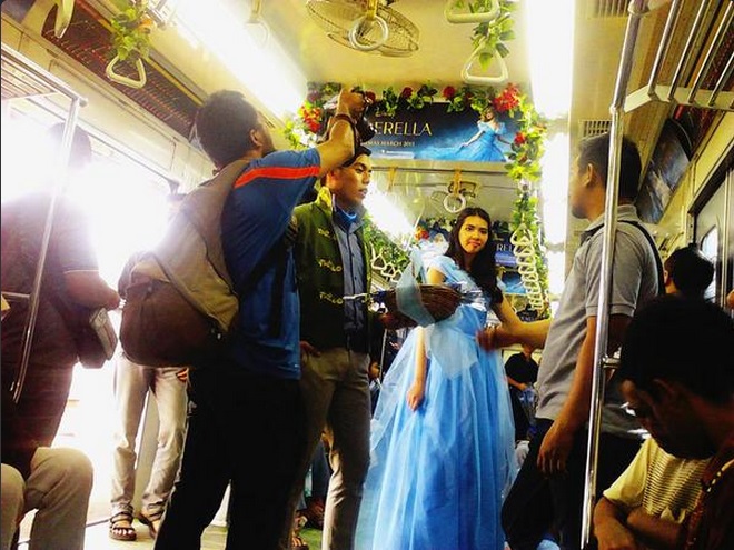 While it might have seemed like a whimsical surprise to some of the commuters on the train, the appearance by Cinderella and her Prince Charming was a carefully planned publicity event for Disney Studio’s upcoming live action version of Cinderella. Trains were prepped with Cinderella advertisements and decorations to make the princess’ appearance feel more appropriate (and on brand).