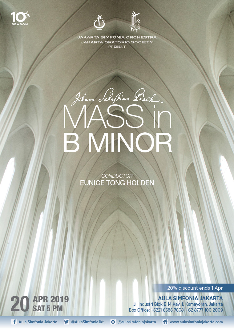 Jakarta Simfonia Orchestra and Jakarta Oratorio Society presents Johann Sebastian Bach Mass in B Minor with conductor Eunice Tong Holden on Saturday, April 20 at 5pm. More info available on Aula Simfonia Jakarta’s website.