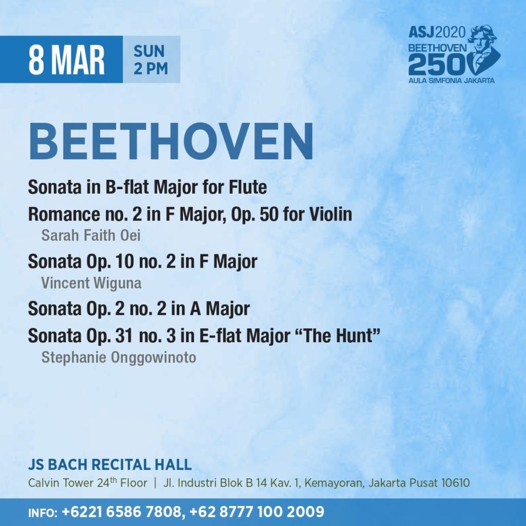 There will be a Beethoven Sonata concert this Sunday, featuring Beethoven’s Sonatas and Romance performed by Sarah Faith Oei on flute and violin, as well as Vincent Wiguna and Stephanie Onggowinoto on piano.
