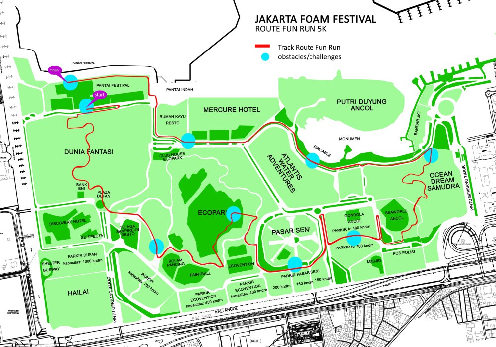 FFI consists of three parts: a 5k fun run, a foam festival and a foam party with DJs. The Fun Run consists of a 9 piece obstacle course, covered in colored foam of course, that runs through Pantai Festival, Dunia Fantasy, Eco Park and the Ancol Art Market, among other venues. Contestants are encouraged to wear costumes with prizes for best dressed.