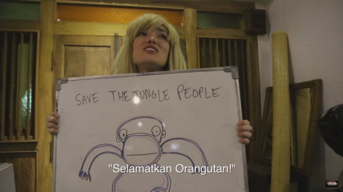 Literal English translation: Save the jungle people (orang hutan = jungle people)