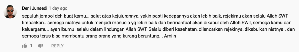 “10 thumbs up for you… I admire your honesty, I’m sure it will be better in the future, Allah SWT will always bestow your fortune upon you. I hope your intention to be a better and useful person will be granted by Allah SWT, I wish you and your family, father and mother, will always be under His protection. Hope you’ll always be given health, fortune will always come your way, your wishes be granted… and hopefully you can always help people who aren’t fortunate… Amen.”