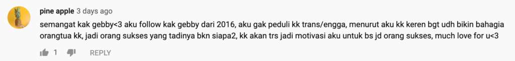 “Keep your spirit up, Kak Gebby. I’ve been following you since 2016, I don’t care whether you’re trans or not. I think you’re so cool you’ve made your parents happy, you started from nothing and became a successful person. You’ll always be my motivation to be a successful person, much love for you.”