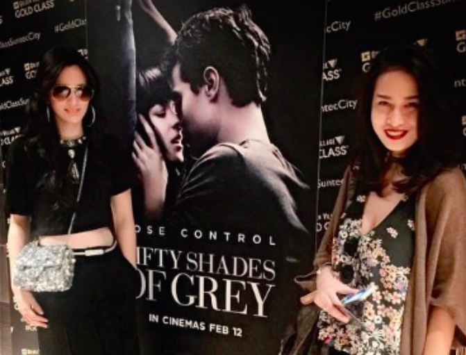 Nia Ramadhani (left) posing in front of a 50 Shades of Grey movie poster with a friend at a cinema in Singapore. Photo: Twitter/@NRamadhani