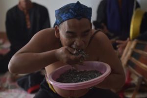 Debus master Aris Afandi puts it to the test as he goes at a fellow fighter’s arm with a machete, although his foot pounding and yelling seems to have more impact than the cut.