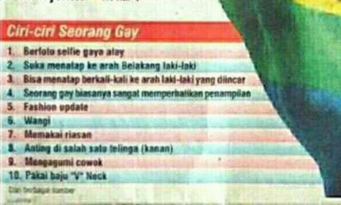 The guidelines appeared in an image of a newspaper clipping that went viral on social media recently. One of the supposed characteristics of a gay Indonesian man, according to the newspaper, is that they wear V neck t-shirts.