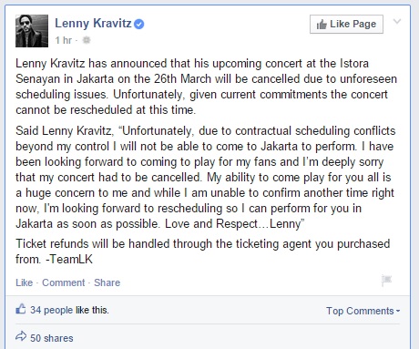 Kravitz joins a long list of international musical acts that have cancelled their concerts in Jakarta including Rihanna, Kesha, Aerosmith and, most infamously, Lady Gaga (although her reasons for cancelling were much more serious than Kravitz’s lame “scheduling issues” excuse).