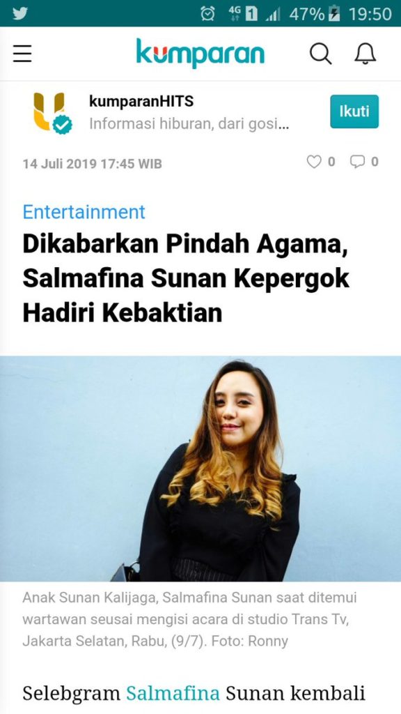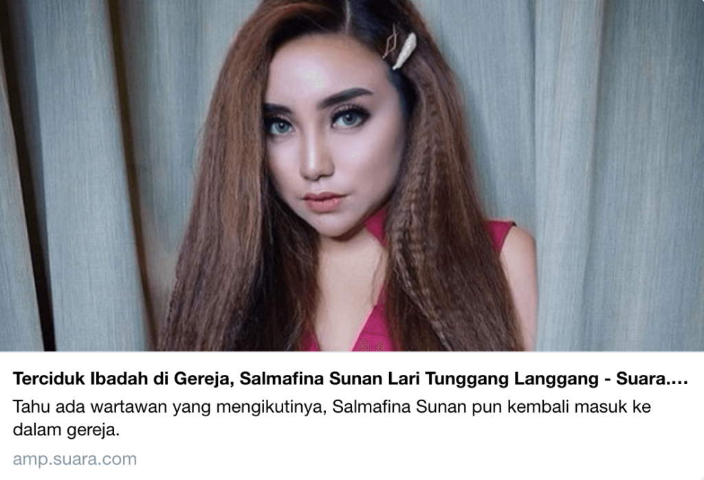 “Dikabarkan pindah agama, Salmafina Sunan kepergok hadiri kebaktian (Rumored to have converted, Salmafina Sunan was caught attending mass)” – Kumparan