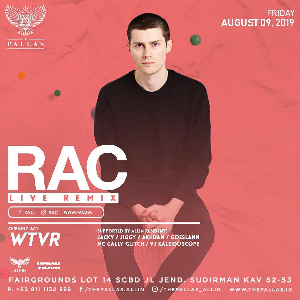 André Allen Anjos, better known by his stage name RAC (Remix Artist Collective), is a Portuguese DJ and record producer. RAC has created more than 200 remixes in rock, electronica, and dance music genres for various musical artists. The vision of RAC is to maintain a style of remixing that strays away from the “club mix” archetype, creating new incarnations of songs that stem from the original structure, but expand on their genre and musical arrangement. Supported by The Pallas’ resident DJs.