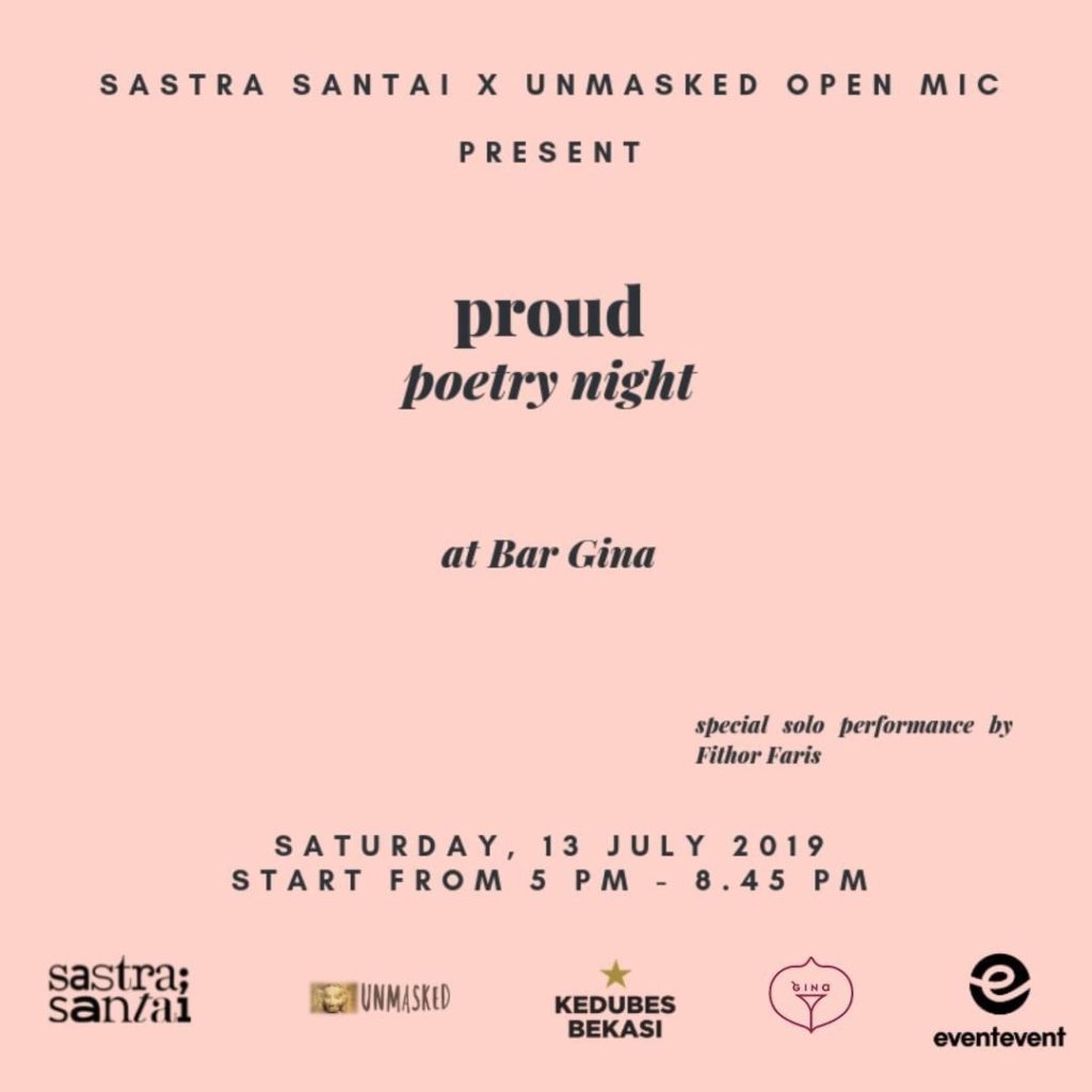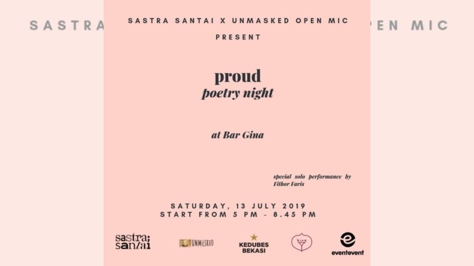 Unmasked Poetry Open Mic and poetry collective Sastra Santai present Proud Poetry Night at Jakarta’s first feminist bar, Bar Gina. Why “Proud”, you ask? Because the organizers simply want you to be proud of yourself and shine with your poems. All are welcomed to listen or recite their poems. If you’d like to perform, kindly shoot a direct message (DM) to Unmasked Poetry Open Mic or Sastra Santai on Instagram, because they only have limited slots for the evening.