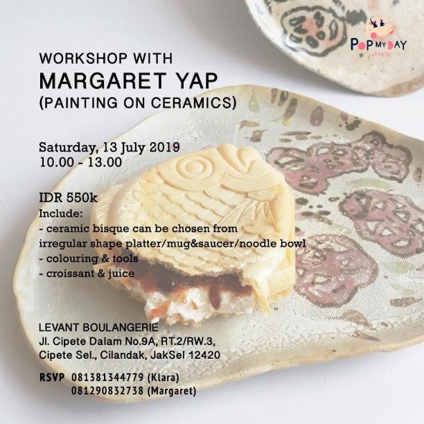 This Saturday, join local artist/ceramicist Margaret Yap and Pop My Day Jakarta on a fun painting session on ceramic bisque. Each participant will be given three types of ceramic bisque to choose from, such as irregular shape platter, mug and saucer, and noodle bowl; coloring and tools; as well as “frenchly” baked croissant (geddit) and juice. You may reserve your spot through Pop My Day Jakarta’s Instagram or by phone.