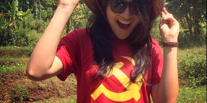 Photograph of Anindya Kusuma Putri wearing a hammer and sickle t-shirt that was uploaded to her Instagram account.