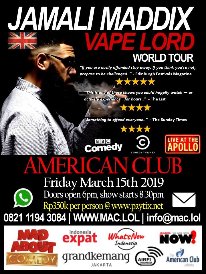Jamali Maddix is an English stand-up comic known for his fearless comedy work, such as hosting a a documentary series in which he interviewed extremists from around the world to understand how they think. He’ll be performing at the American Club this Friday. Tickers Rp 350k. For more info