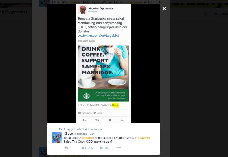 The current “LGBT panic” in Indonesia is getting even more ridiculous. Yesterday, famous TV cleric Abdullah Gymnastiar (aka AA Gym), essentially called upon his 1.69 million Twitter followers to protest coffee giant Starbucks after he found out that the company supports marriage equality.