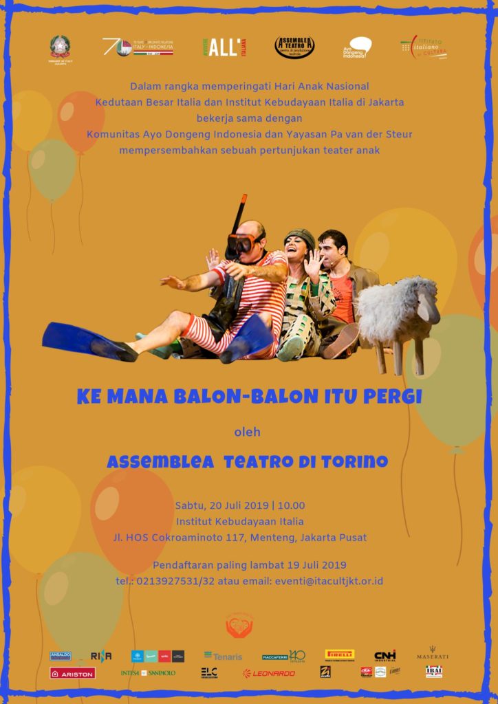 To celebrate Indonesia’s National Children’s Day on July 23, the Italian Embassy and Istituto Italiano di Cultura Jakarta, in cooperation with Ayo Dongeng Indonesia and Pa van der Steur Foundation, present a play for children titled Ke Mana Balon-Balon Itu Pergi (Where did the Balloons Go) by Assemblea Teatro di Torino. The show is suitable for children aged six and above, and it will be conducted in Italian with Indonesian translation.