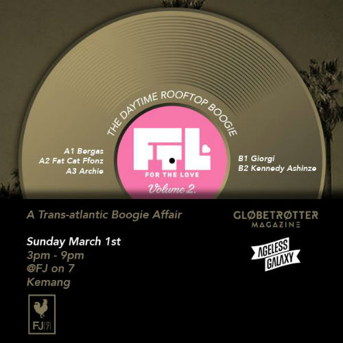 A Sunday daytime rooftop boogie session hosted by the good folks at Globetrotter Magazine. Featuring a blend of modern funk, electronica, dub, world and afroboogie niceness, should be a fun way to extend the weekend’s party vibe. Archie, Bergas, Fat Cat Ffonz, Giorgi and Kennedy Ashinze will man the decks.
