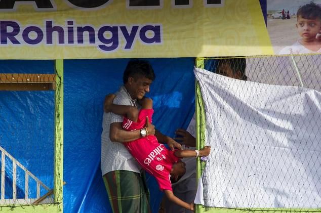 A Rohingya migrant plays with a child at a shelter in Kuala Cangkoi, Indonesia’s Aceh province. Photo: AFP/Chaideer Mahyuddin