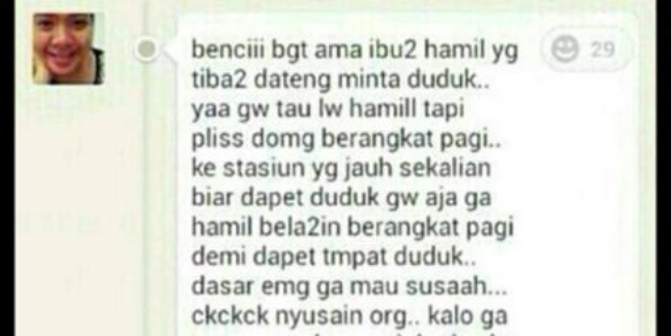 Dinda was probably well within her right to refuse to give up her seat to a pregnant woman on the KRL Commuter Line (although that is a pretty a dick move), but she just had to post about her experience on Path. Dinda wrote about how much she hated that people were obliged to give up their seats to pregnant women, especially since she had to get up early so she could secure a seat on the train.